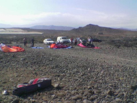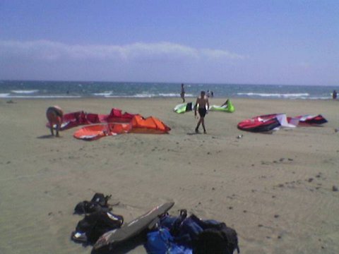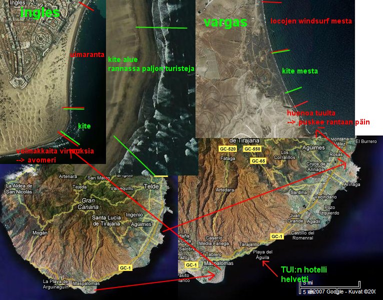 Eli kite mestat on noiden vihreiden viivojen välissä. Tuolla inglesissä (siis maspalomasin dyyneillä) pitää haikata joku reilu kilometri kamojen kanssa dyynien yli rannalle. Siellä ei periaatteessa ole kite rantaa ja homma on vähän vaakalaudalla, kamat jätetään rantakahvion jälkeen olevan pelastusrenkaan (tms. kysy) eteläpuolelle. Veteen kantsii mennä varovasti sillä rannassa kävelee koko ajan nnn. turistia jotka jää ihmettelemään touhuja. Leijaa ei siis voi pitää kovin alhaalla, koska joutuu pujottelemaan jengin läpi, vedessä voi olla myös uimareita, joten boarddragillä riittävän kauas veteen ja menoksi. Niemenkärjen yli ei kantsi mennä sillä jos tulee härsi niin virtaukset on välillä niin voimakkaat ettei vastaan uida tms. munasyvyisessä vedessä kahlaaminenkin oli hankalaa. Tuuli saattaa myös muuttua vartissa puhaltamaan off shorena, tästä merkkinä, että kaikki locot katoaa rantaan ja rupee pakkaamaan kamoja sekä tuuli kevenee ja muuttuu puuskaiseksi. Kymmenen minuutin päästä tuuli alkaa puhaltamaan reippaasti merelle päin --> iso härsi, fuerte on 100km päässä ja afrikkaan 200km..!